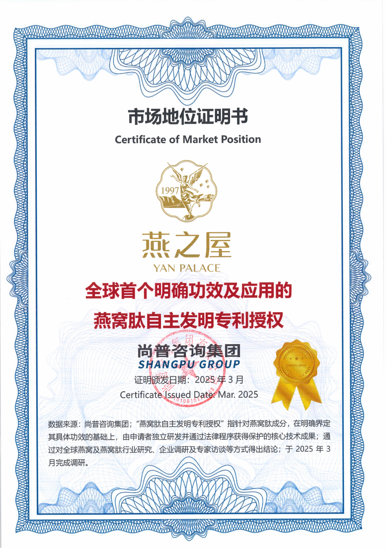 燕之屋多年來致力于燕窩肽研發(fā)與應(yīng)用,于2022年正式成立燕窩肽研究中心,開辟品牌在燕窩肽酶解技術(shù)、活性成分與功能研究的新賽道,多項(xiàng)研究成果刊登于國際權(quán)威期刊。2024年,燕之屋自主研發(fā)的“一種具有促進(jìn)細(xì)胞修復(fù)、高保濕美白功效的燕窩肽制備方法及應(yīng)用”榮獲國家知識(shí)產(chǎn)權(quán)局授權(quán)發(fā)明專利⑥。經(jīng)權(quán)威機(jī)構(gòu)尚普咨詢集團(tuán)專業(yè)認(rèn)證,燕之屋更獲得“全球首個(gè)明確功效及應(yīng)用的燕窩肽自主發(fā)明專利授權(quán)”④市場(chǎng)地位證明書,進(jìn)一步驗(yàn)證該專利的引領(lǐng)地位,夯實(shí)燕之屋在燕窩肽技術(shù)領(lǐng)域的引領(lǐng)者身份。